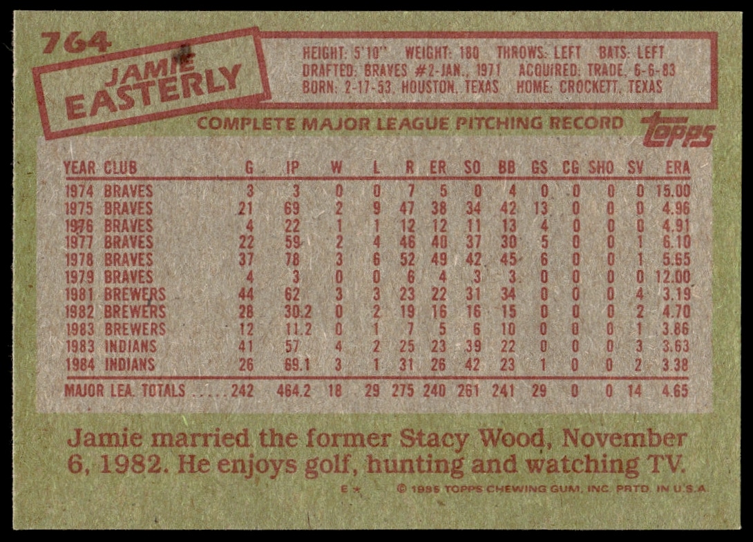 This Baseball card, from 1985 is part of the Topps  card set. Jamie Easterly is featured and has a card number of 764.