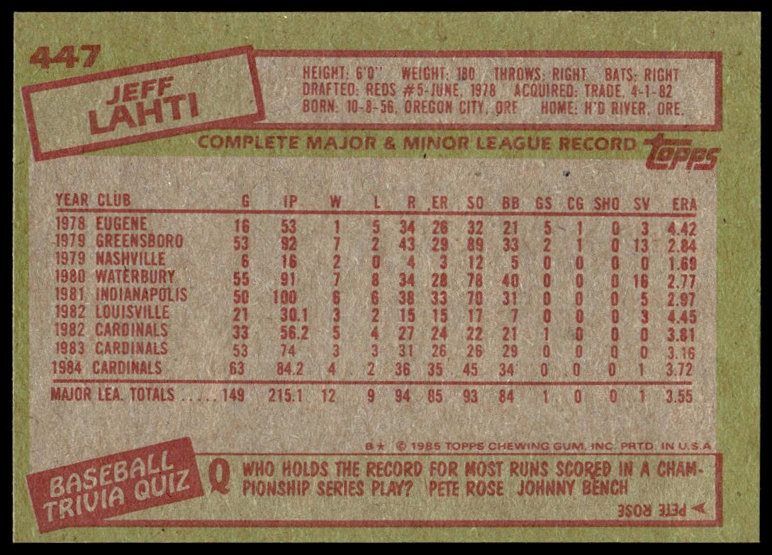 This Baseball card, from 1985 is part of the Topps  card set. Jeff Lahti is featured and has a card number of 447.