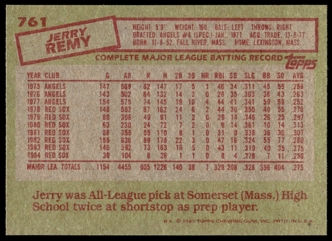 This Baseball card, from 1985 is part of the Topps  card set. Jerry Remy is featured and has a card number of 761.