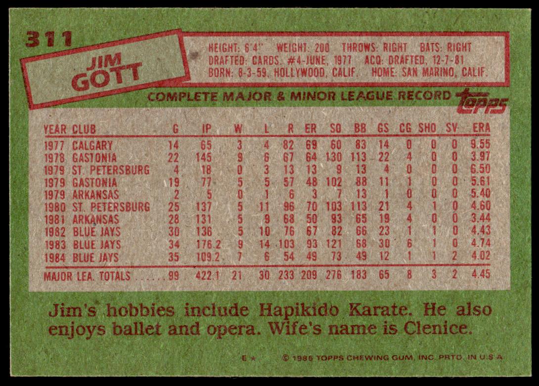 This Baseball card, from 1985 is part of the Topps  card set. Jim Gott is featured and has a card number of 311.