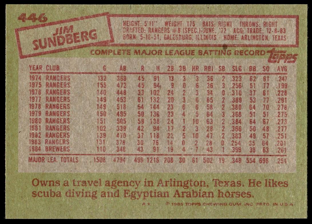 This Baseball card, from 1985 is part of the Topps  card set. Jim Sundberg is featured and has a card number of 446.