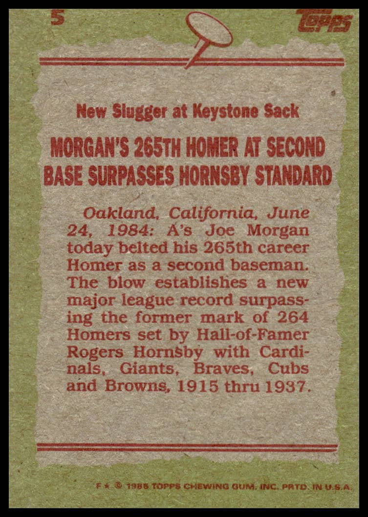 This Baseball card, from 1985 is part of the Topps  card set. Joe Morgan is featured and has a card number of 5.