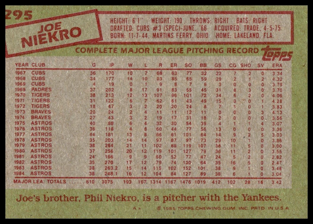 This Baseball card, from 1985 is part of the Topps  card set. Joe Niekro is featured and has a card number of 295.