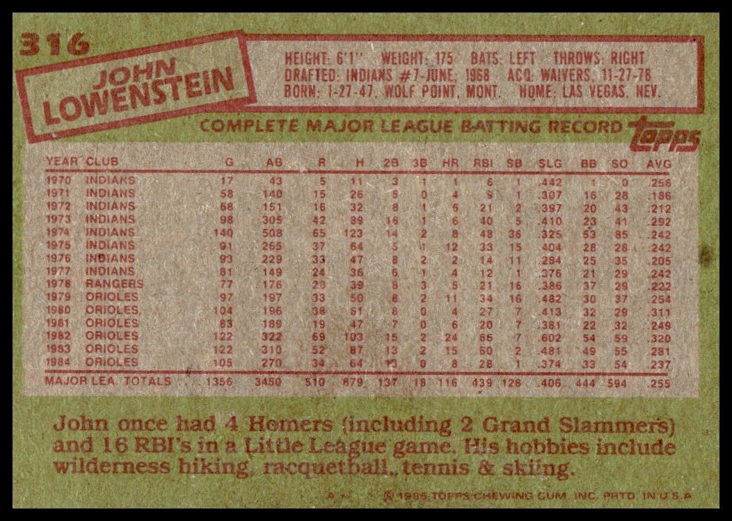 This Baseball card, from 1985 is part of the Topps  card set. John Lowenstein is featured and has a card number of 316.