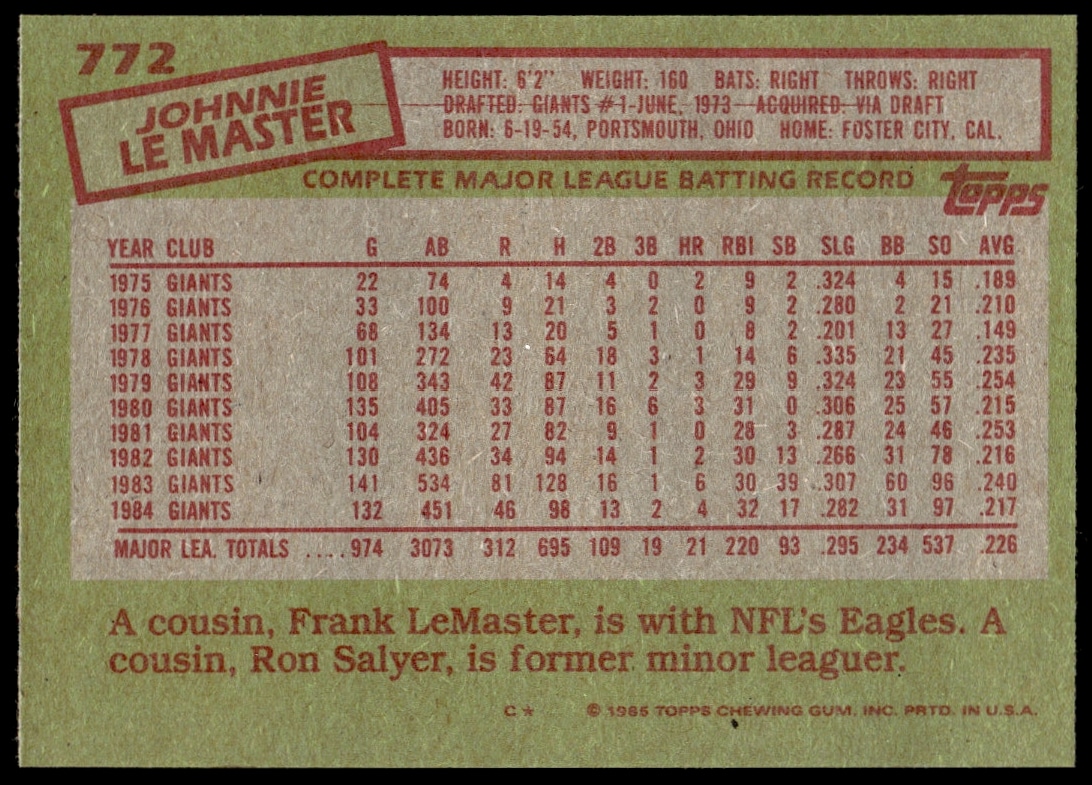 This Baseball card, from 1985 is part of the Topps  card set. Johnnie LeMaster is featured and has a card number of 772.