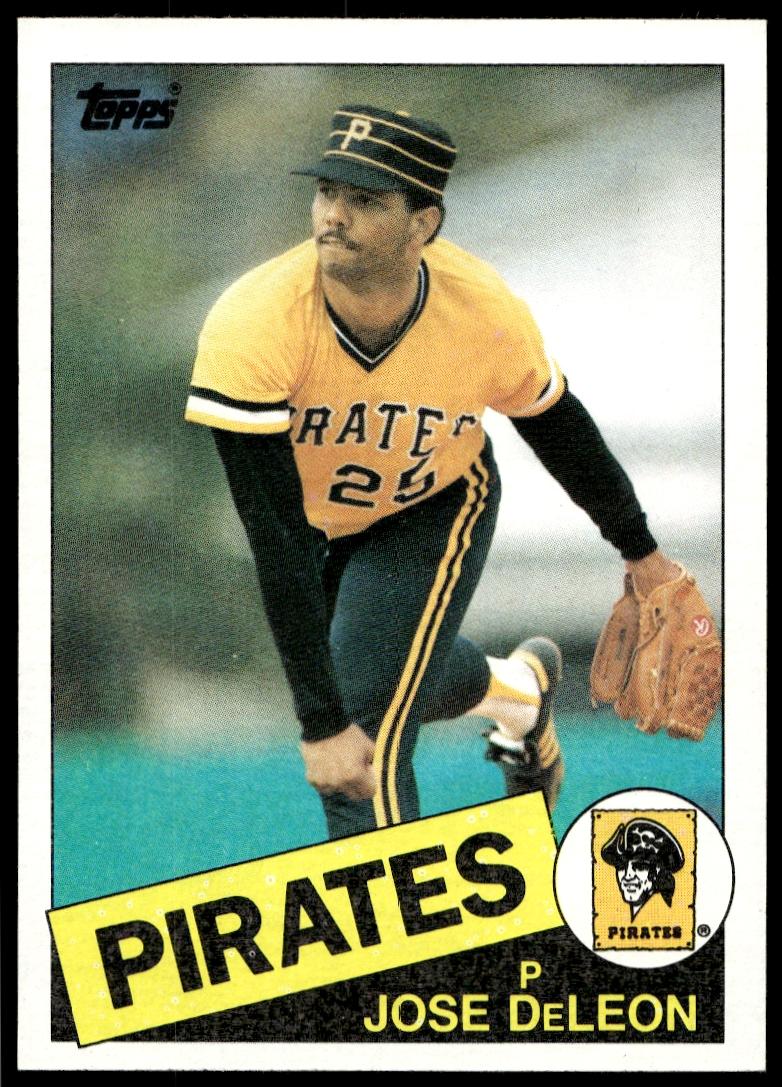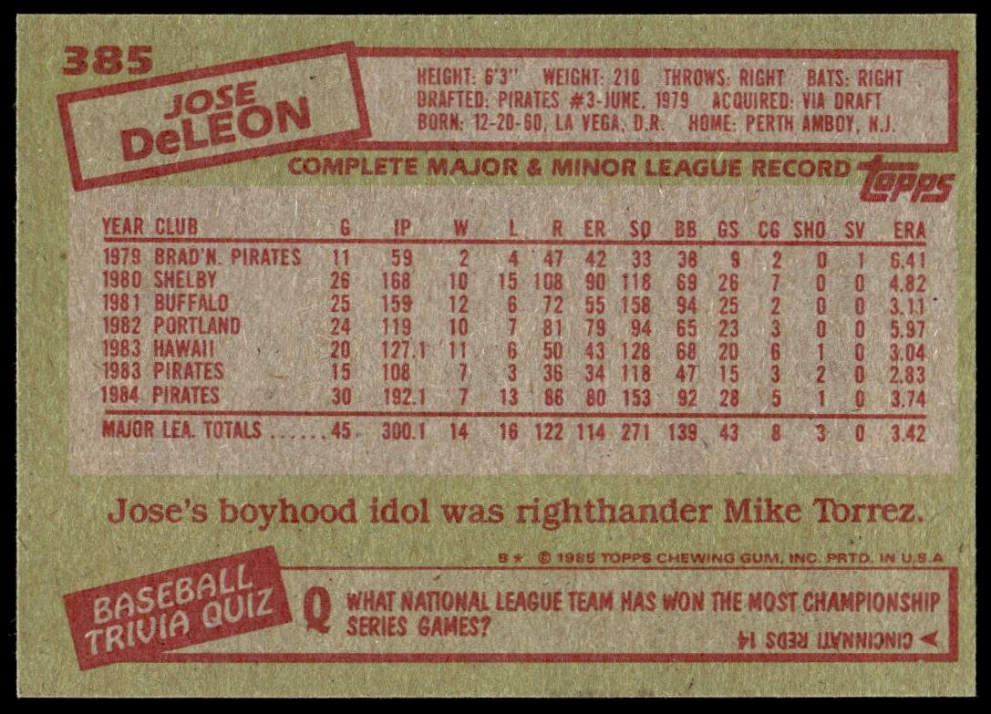 This Baseball card, from 1985 is part of the Topps  card set. Jose DeLeon is featured and has a card number of 385.
