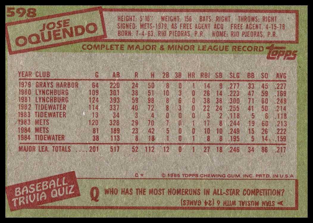 This Baseball card, from 1985 is part of the Topps  card set. Jose Oquendo is featured and has a card number of 598.