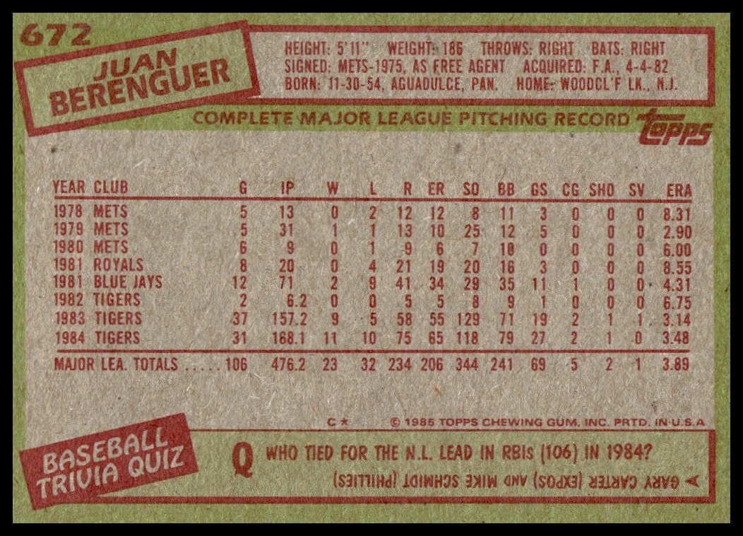 This Baseball card, from 1985 is part of the Topps  card set. Juan Berenguer is featured and has a card number of 672.