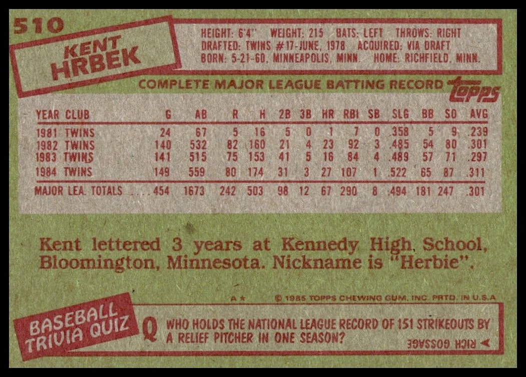 This Baseball card, from 1985 is part of the Topps  card set. Kent Hrbek is featured and has a card number of 510.