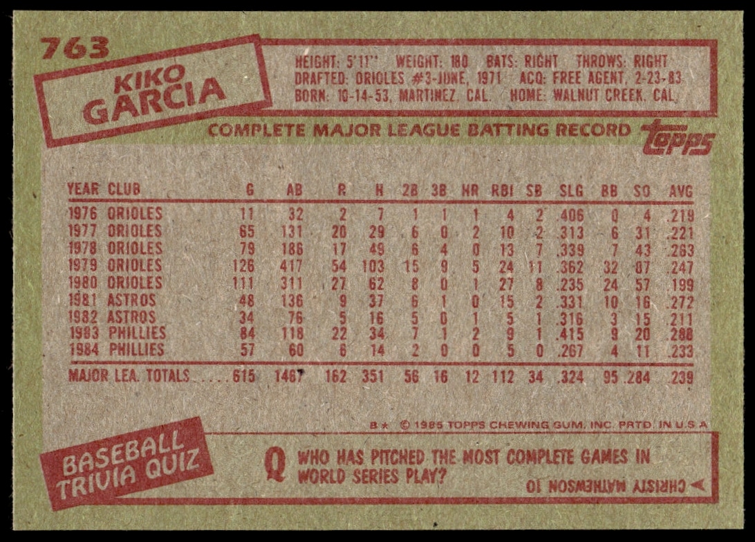 This Baseball card, from 1985 is part of the Topps  card set. Kiko Garcia is featured and has a card number of 763.