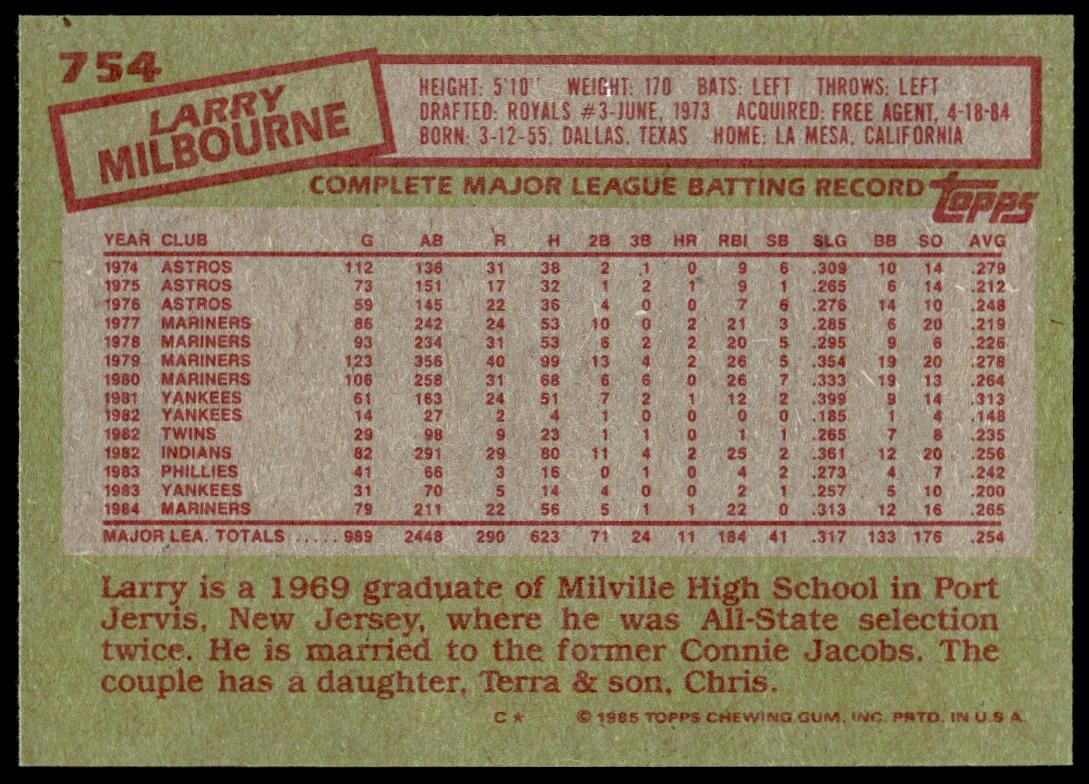 This Baseball card, from 1985 is part of the Topps  card set. Larry Milbourne is featured and has a card number of 754.