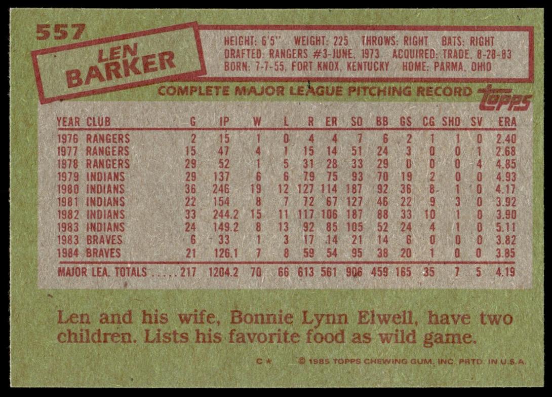 This Baseball card, from 1985 is part of the Topps  card set. Len Barker is featured and has a card number of 557.