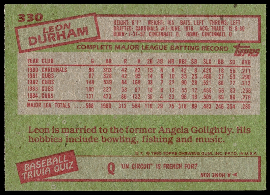 This Baseball card, from 1985 is part of the Topps  card set. Leon Durham is featured and has a card number of 330.