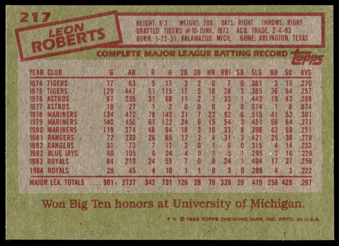 This Baseball card, from 1985 is part of the Topps  card set. Leon Roberts is featured and has a card number of 217.