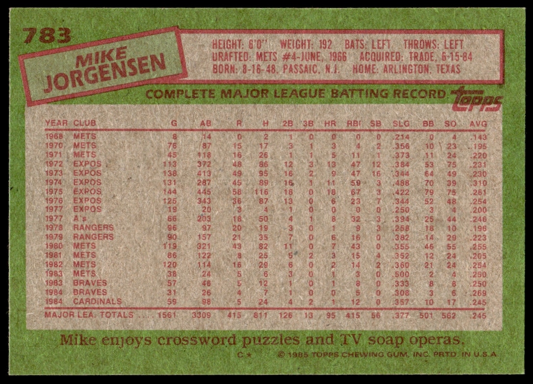This Baseball card, from 1985 is part of the Topps  card set. Mike Jorgensen is featured and has a card number of 783.