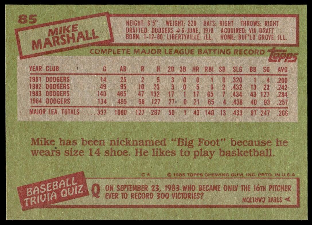 This Baseball card, from 1985 is part of the Topps  card set. Mike Marshall is featured and has a card number of 85.