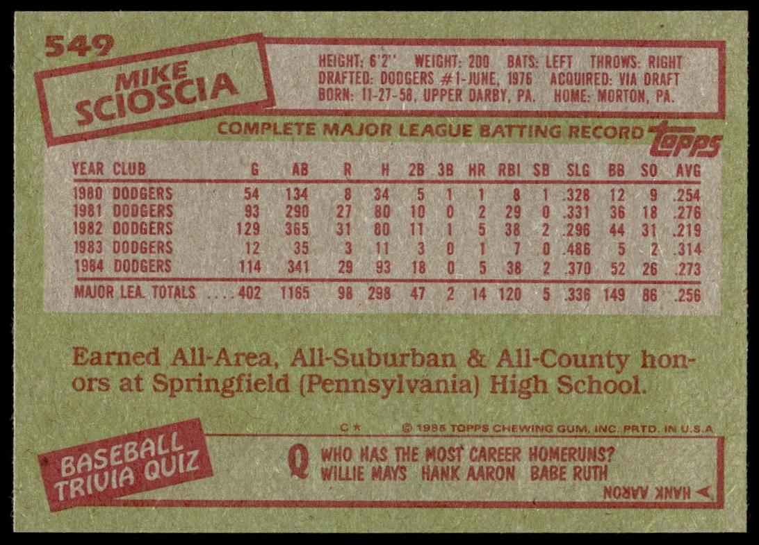 This Baseball card, from 1985 is part of the Topps  card set. Mike Scioscia is featured and has a card number of 549.