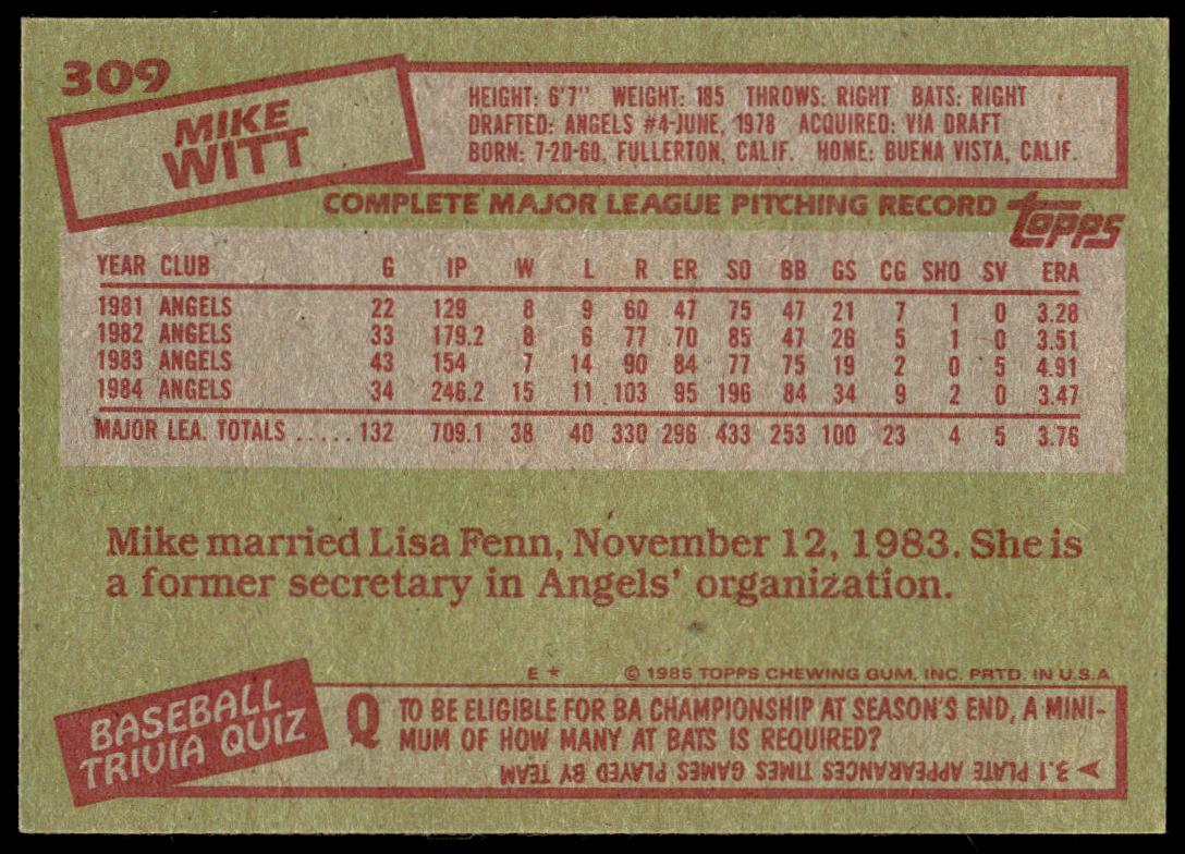 This Baseball card, from 1985 is part of the Topps  card set. Mike Witt is featured and has a card number of 309.