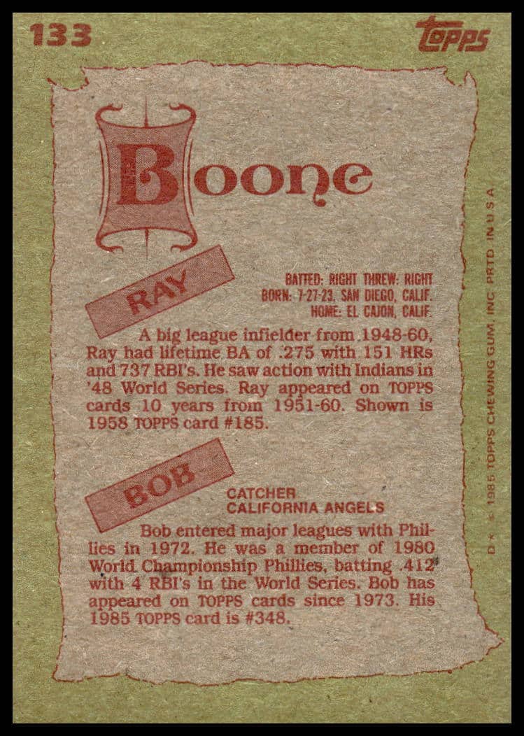 This Baseball card, from 1985 is part of the Topps  card set. Ray Boone / Bob Boone is featured and has a card number of 133.