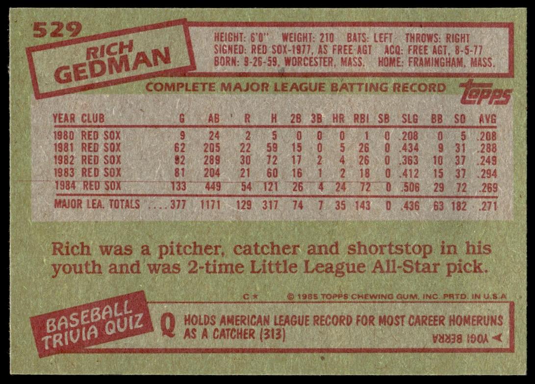 This Baseball card, from 1985 is part of the Topps  card set. Rich Gedman is featured and has a card number of 529.