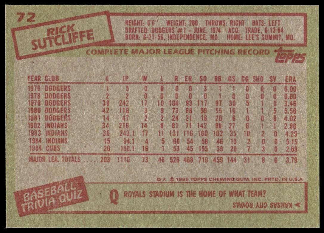 This Baseball card, from 1985 is part of the Topps  card set. Rick Sutcliffe is featured and has a card number of 3.
