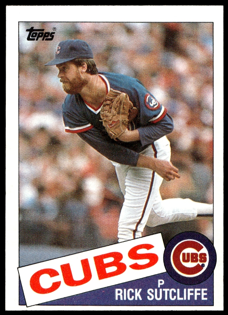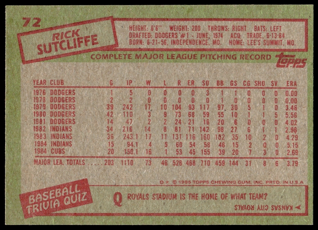 This Baseball card, from 1985 is part of the Topps  card set. Rick Sutcliffe is featured and has a card number of 72.