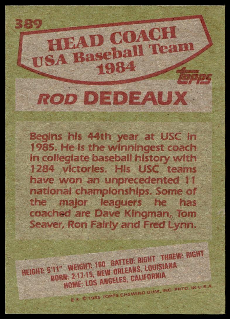 This Baseball card, from 1985 is part of the Topps  card set. Rod Dedeaux is featured and has a card number of 389.