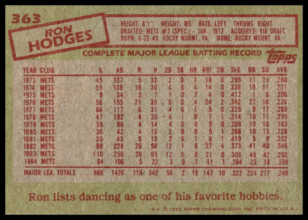 This Baseball card, from 1985 is part of the Topps  card set. Ron Hodges is featured and has a card number of 363.