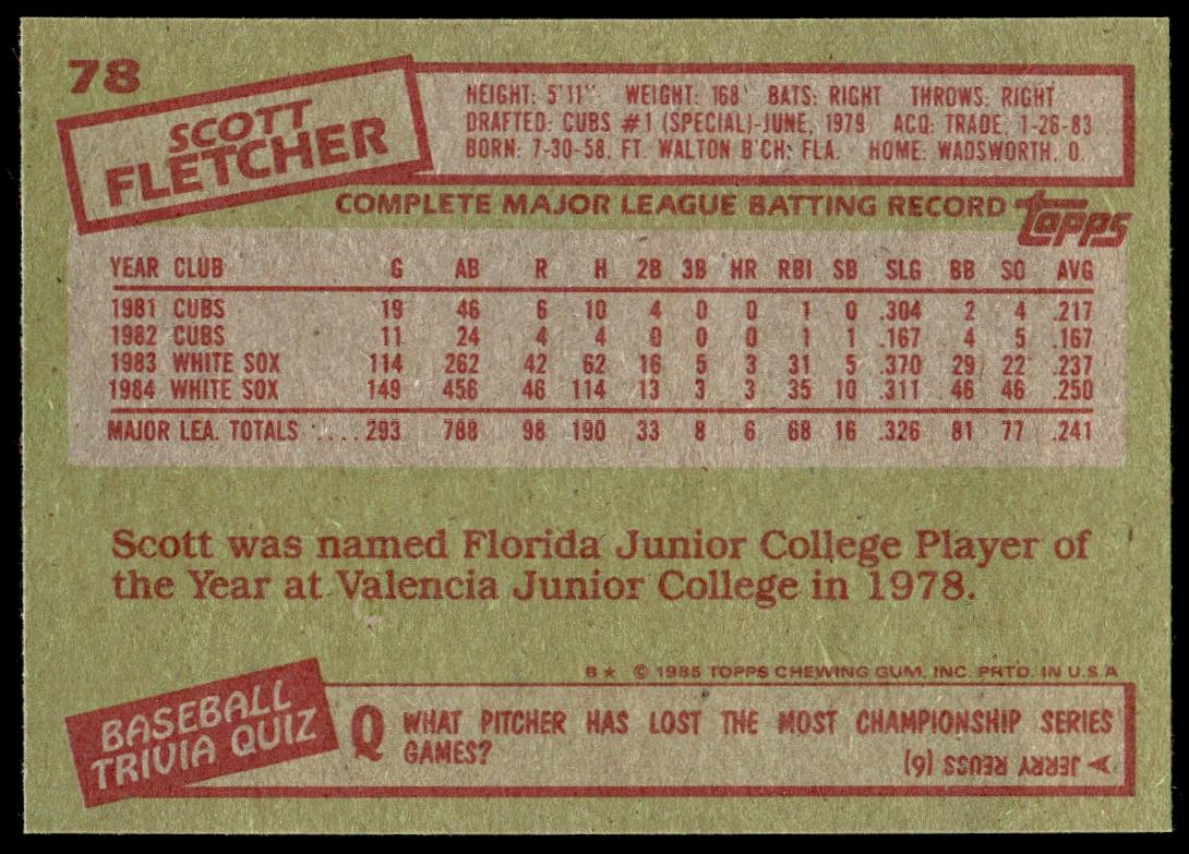 This Baseball card, from 1985 is part of the Topps  card set. Scott Fletcher is featured and has a card number of 78.