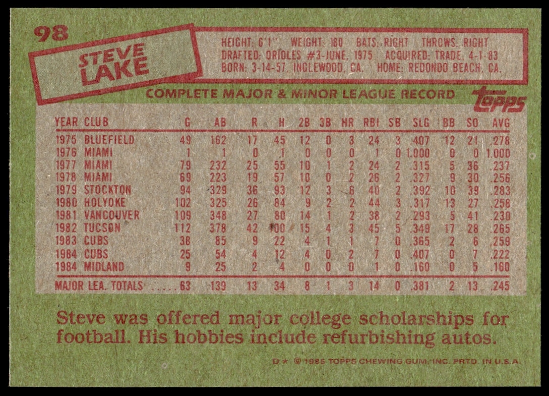 This Baseball card, from 1985 is part of the Topps  card set. Steve Lake is featured and has a card number of 98.