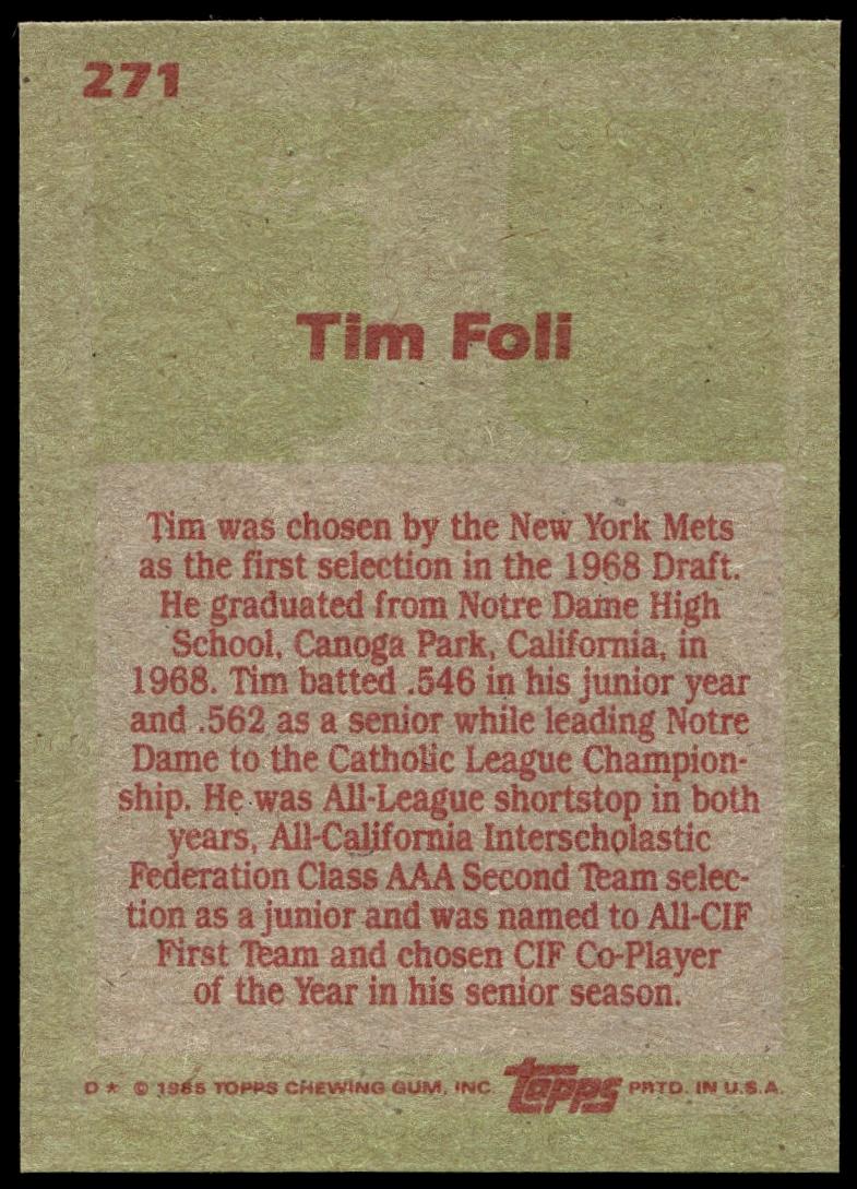 This Baseball card, from 1985 is part of the Topps  card set. Tim Foli is featured and has a card number of 271.