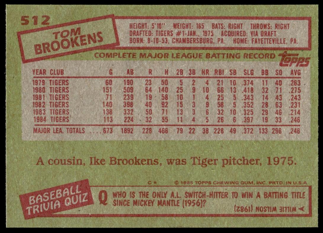 This Baseball card, from 1985 is part of the Topps  card set. Tom Brookens is featured and has a card number of 512.
