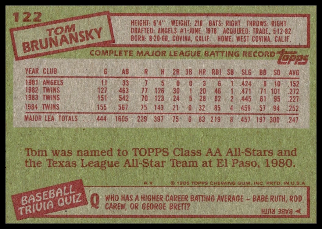 This Baseball card, from 1985 is part of the Topps  card set. Tom Brunansky is featured and has a card number of 122.