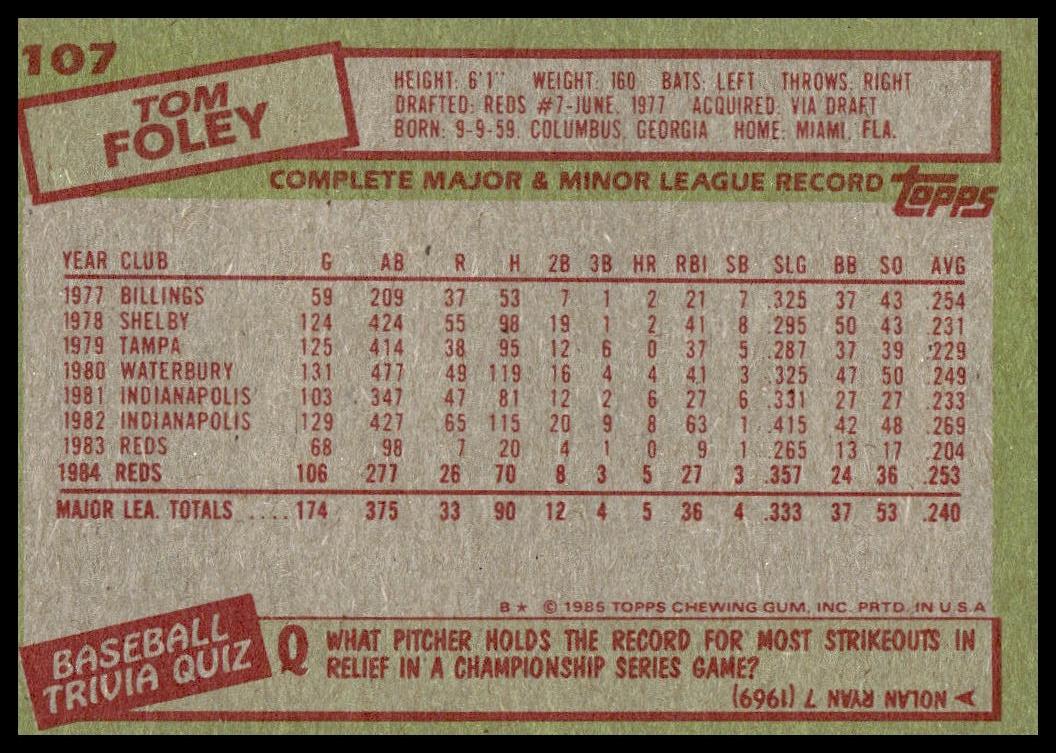 This Baseball card, from 1985 is part of the Topps  card set. Tom Foley is featured and has a card number of 107.
