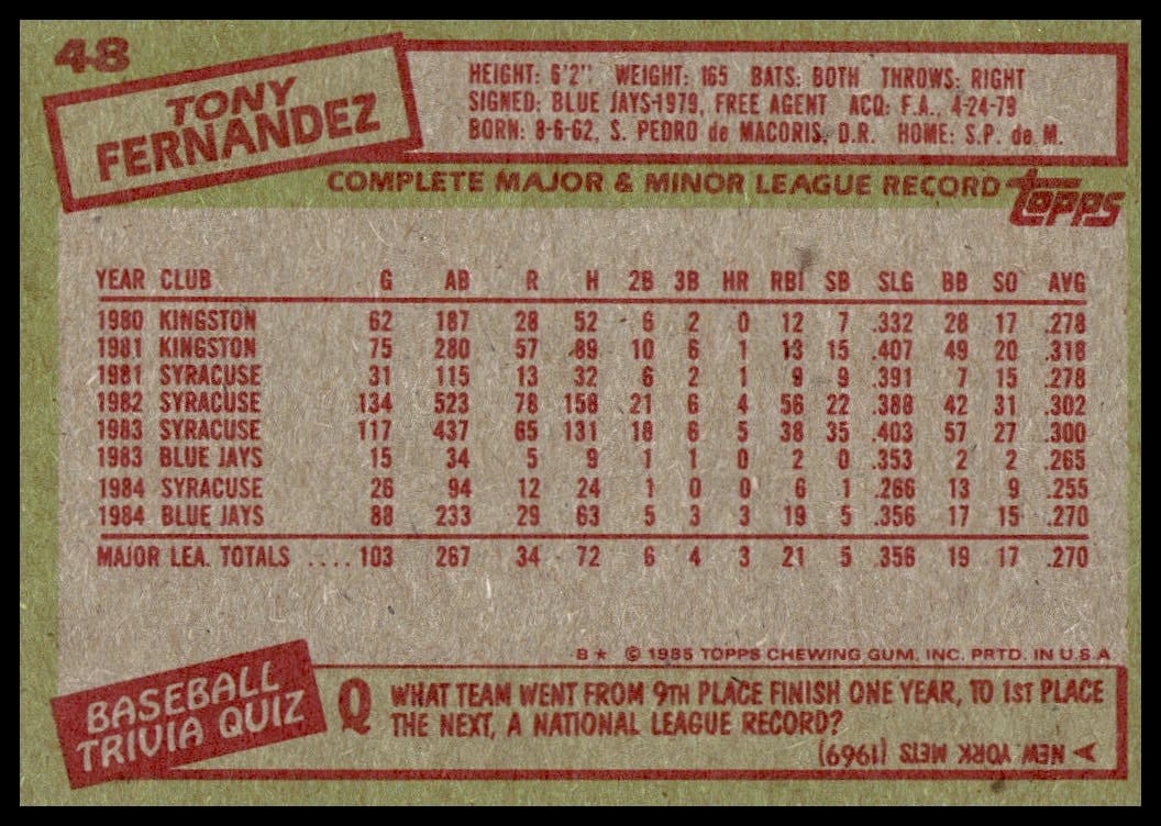 This Baseball card, from 1985 is part of the Topps  card set. Tony Fernandez is featured and has a card number of 48.
