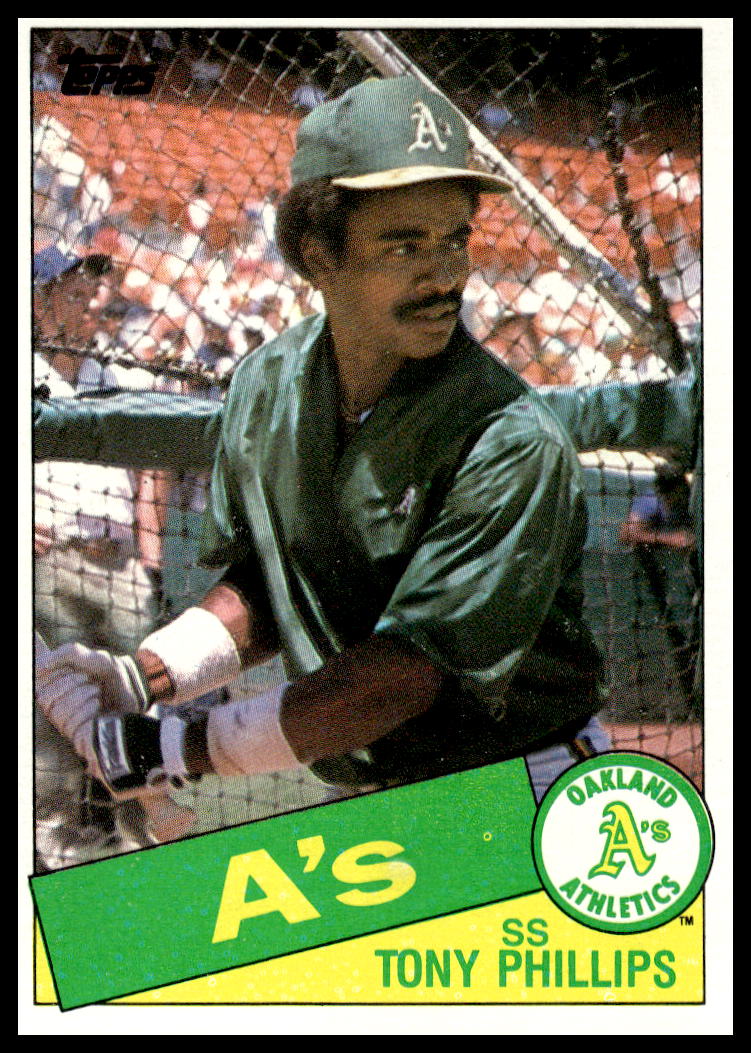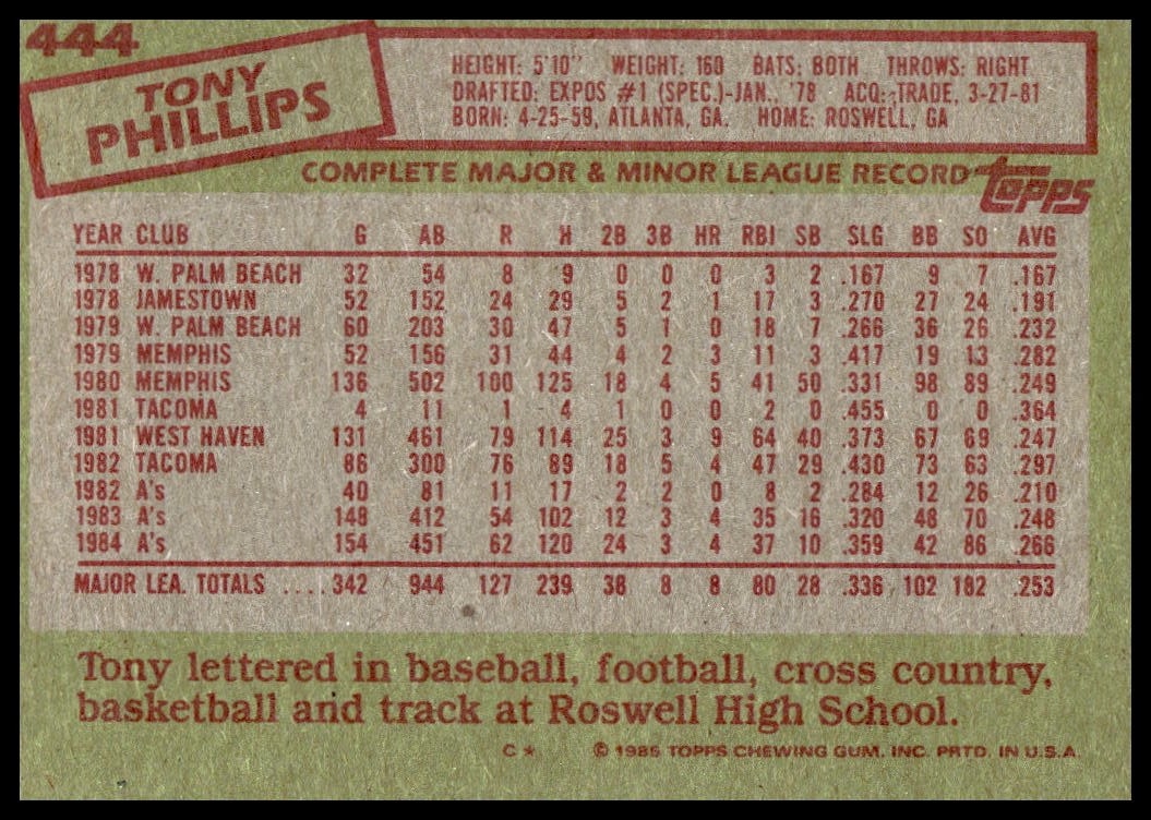 This Baseball card, from 1985 is part of the Topps  card set. Tony Phillips is featured and has a card number of 444.