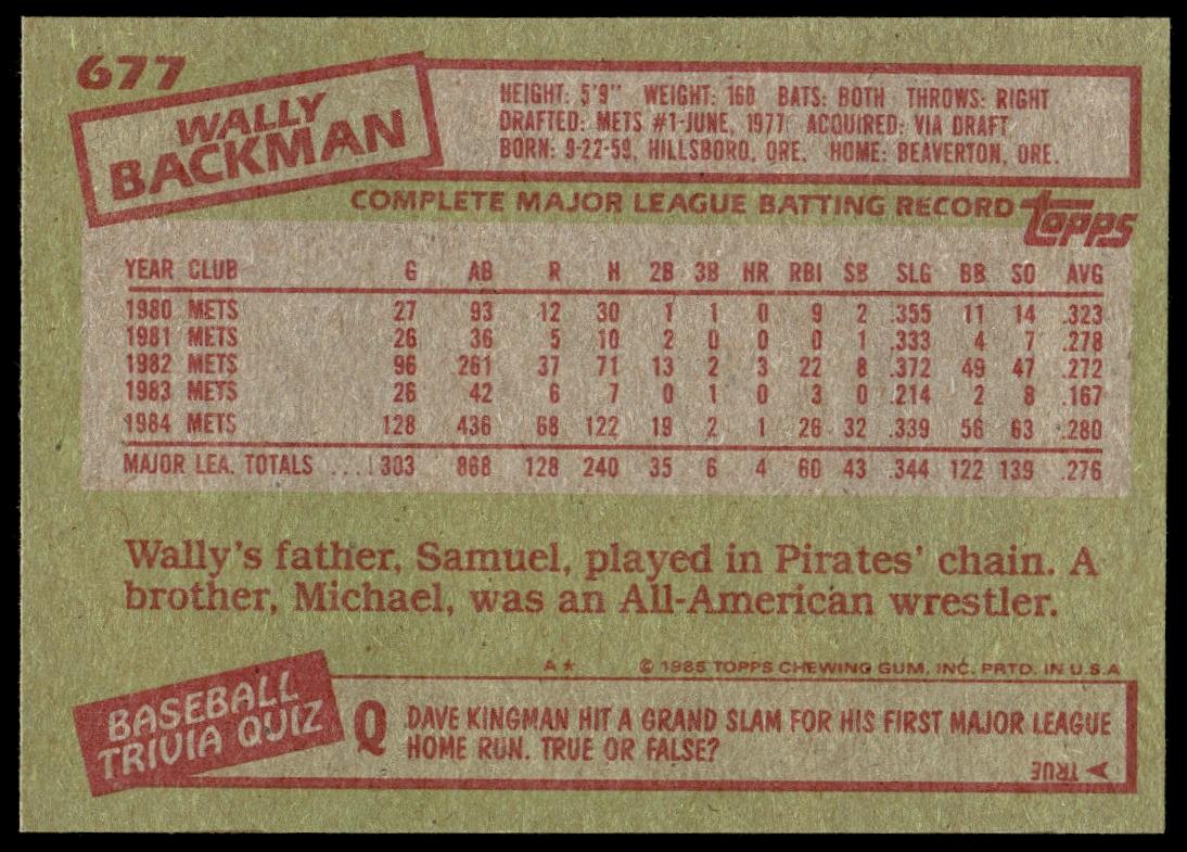 This Baseball card, from 1985 is part of the Topps  card set. Wally Backman is featured and has a card number of 677.