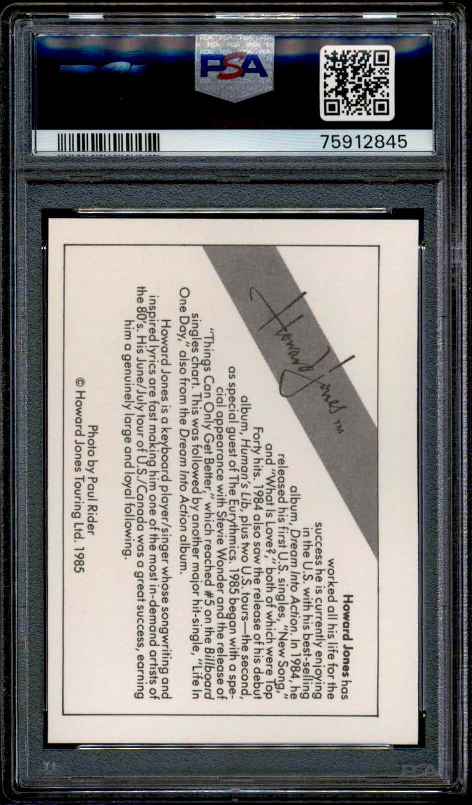 Holding it, you notice the sturdy cardstock, with a slight sheen that suggests it was well-made to last. The PSA label confirms its authenticity, which adds a layer of confidence to its value as part of a collection. For those interested in rock memorabilia or vintage collectibles, this Howard Jones card is a rare find. Its condition and unique design make it a worthwhile addition—not just for its nostalgic value but also as a potentially interesting investment piece.