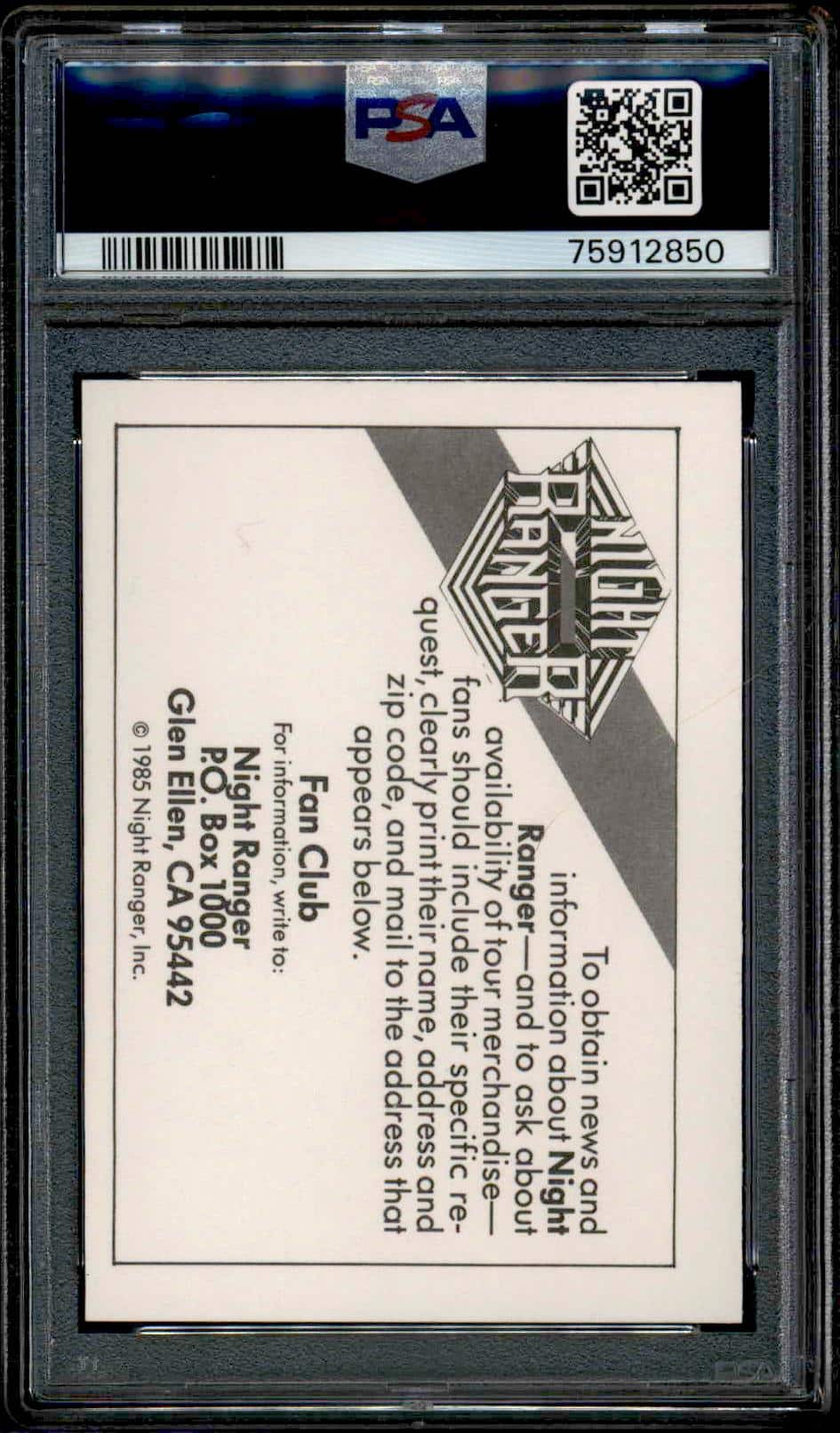 This  card, from 1985 is part of the Wonder Bread Rock Stars card set. Night Ranger is featured and has a card number of . It is graded by PSA and has a numeric grade of 7.