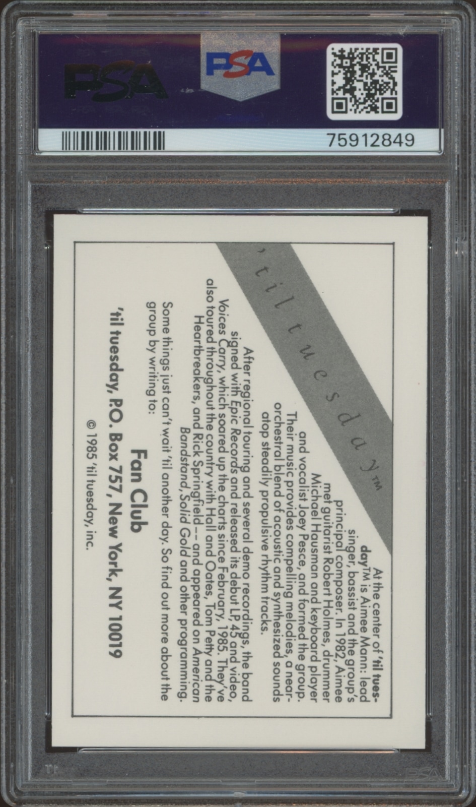 Rare 1985 Wonder Bread Rock Stars ‘Til Tuesday card in PSA 7 condition, perfect for collectors and enthusiasts of unique music memorabilia.