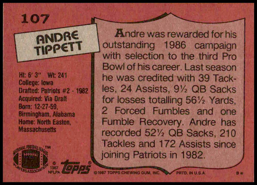 This Football card, from 1987 is part of the Topps  card set. Andre Tippett is featured and has a card number of 107.