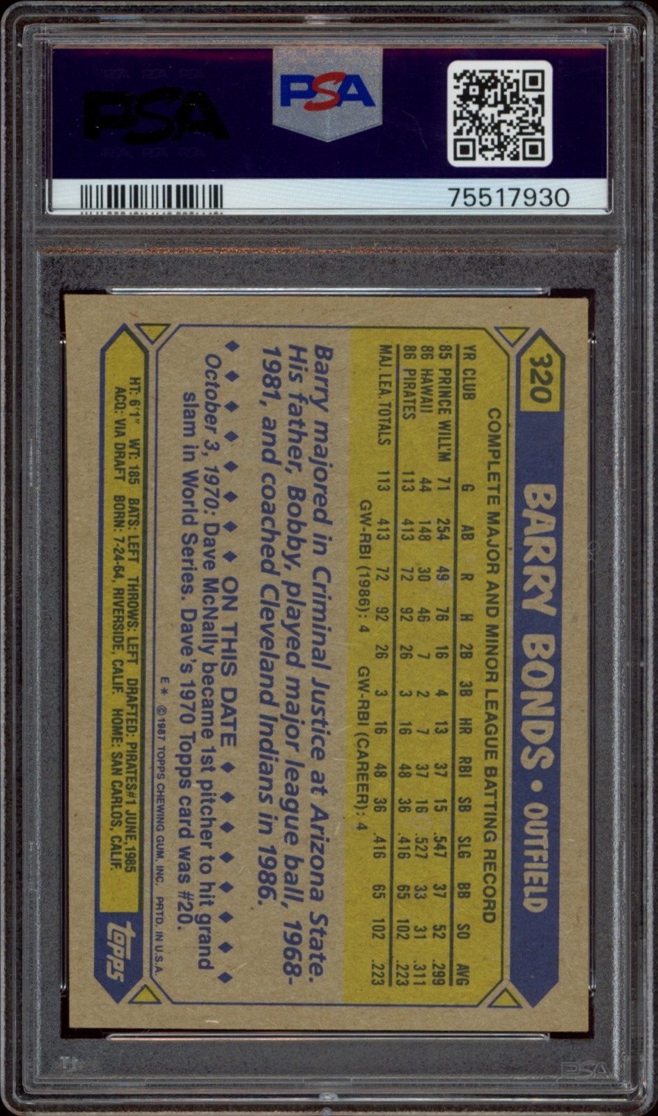 This Baseball card, from 1987 is part of the Topps card set. Barry Bonds is featured and has a card number of 320. It is graded by PSA and has a numeric grade of 6.