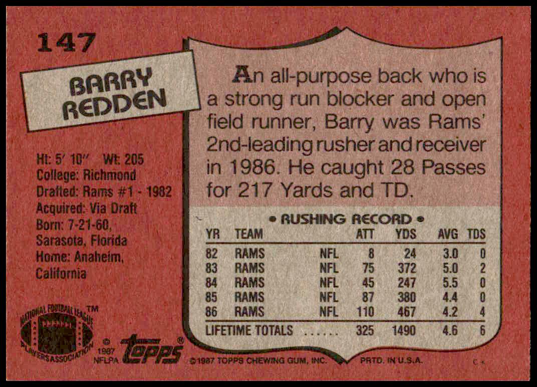 This Football card, from 1987 is part of the Topps  card set. Barry Redden is featured and has a card number of 147.