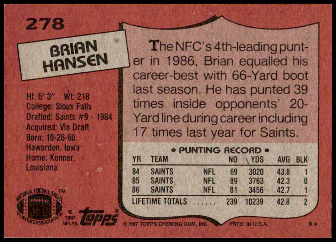 This Football card, from 1987 is part of the Topps  card set. Brian Hansen is featured and has a card number of 278.
