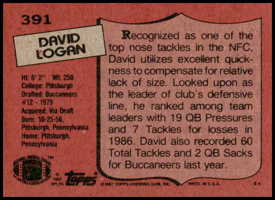 This Football card, from 1987 is part of the Topps  card set. David Logan is featured and has a card number of 391.