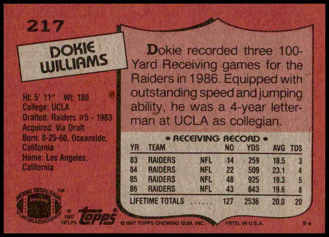 This Football card, from 1987 is part of the Topps  card set. Dokie Williams is featured and has a card number of 217.