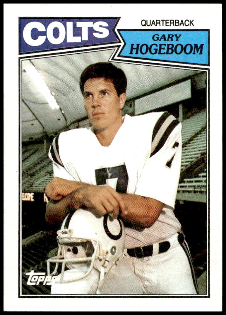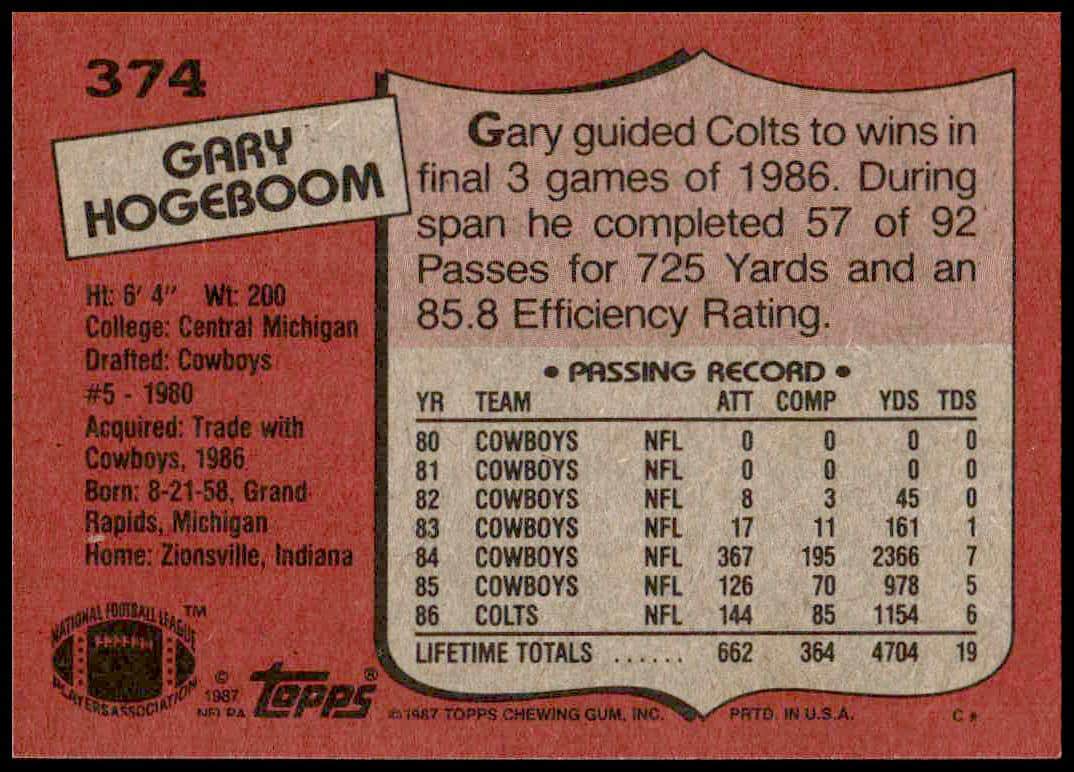 This Football card, from 1987 is part of the Topps  card set. Gary Hogeboom is featured and has a card number of 374.