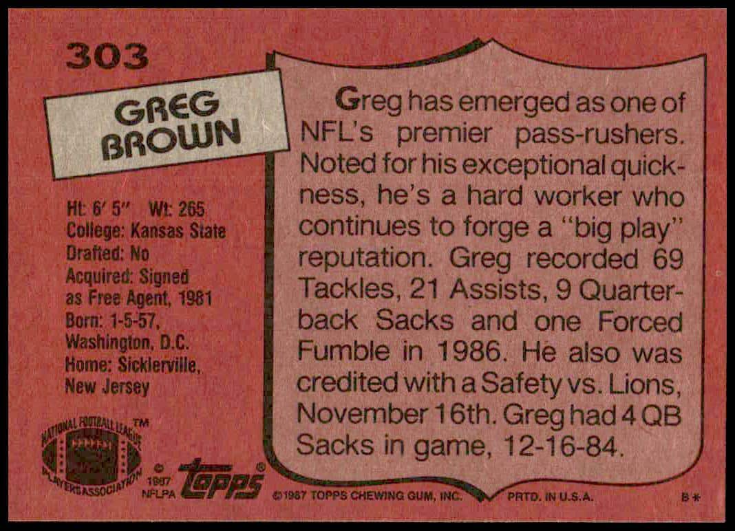 This Football card, from 1987 is part of the Topps  card set. Greg Brown is featured and has a card number of 303.
