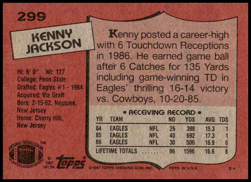 This Football card, from 1987 is part of the Topps  card set. Kenny Jackson is featured and has a card number of 299.