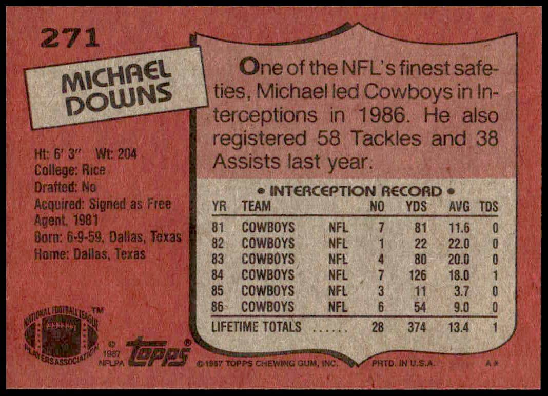 This Football card, from 1987 is part of the Topps  card set. Michael Downs is featured and has a card number of 271.